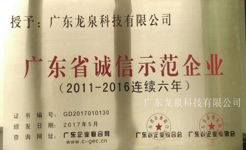 2017年5月10日,廣東龍泉在第23屆廣東省企業(yè)家活動日大會上獲頒廣東省誠信示范企業(yè)證書及牌匾,連續(xù)六年成為廣東省誠信示范單位。 廣東省誠信示范企業(yè)牌匾 廣東省誠信示范企業(yè)...
