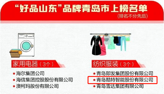 2022.03.143月2日,山東省政府新聞辦召開新聞發(fā)布會,介紹“好品山東”建設主要內(nèi)容、推進情況及下步打算,并發(fā)布了第一批“好品山東”品牌名單,其中,青島酷特智能股份有限公司榜上有名。