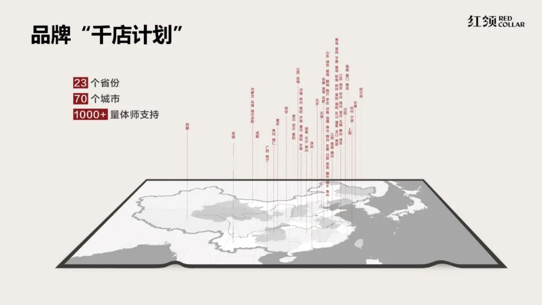 據(jù)張?zhí)N藍(lán)介紹,“紅領(lǐng)REDCOLLAR”品牌2021年底于23個(gè)省份70個(gè)城市完成200家門(mén)店的開(kāi)業(yè)計(jì)劃,計(jì)劃到2024年實(shí)現(xiàn)1000家店的規(guī)模,全面覆蓋各大城市。