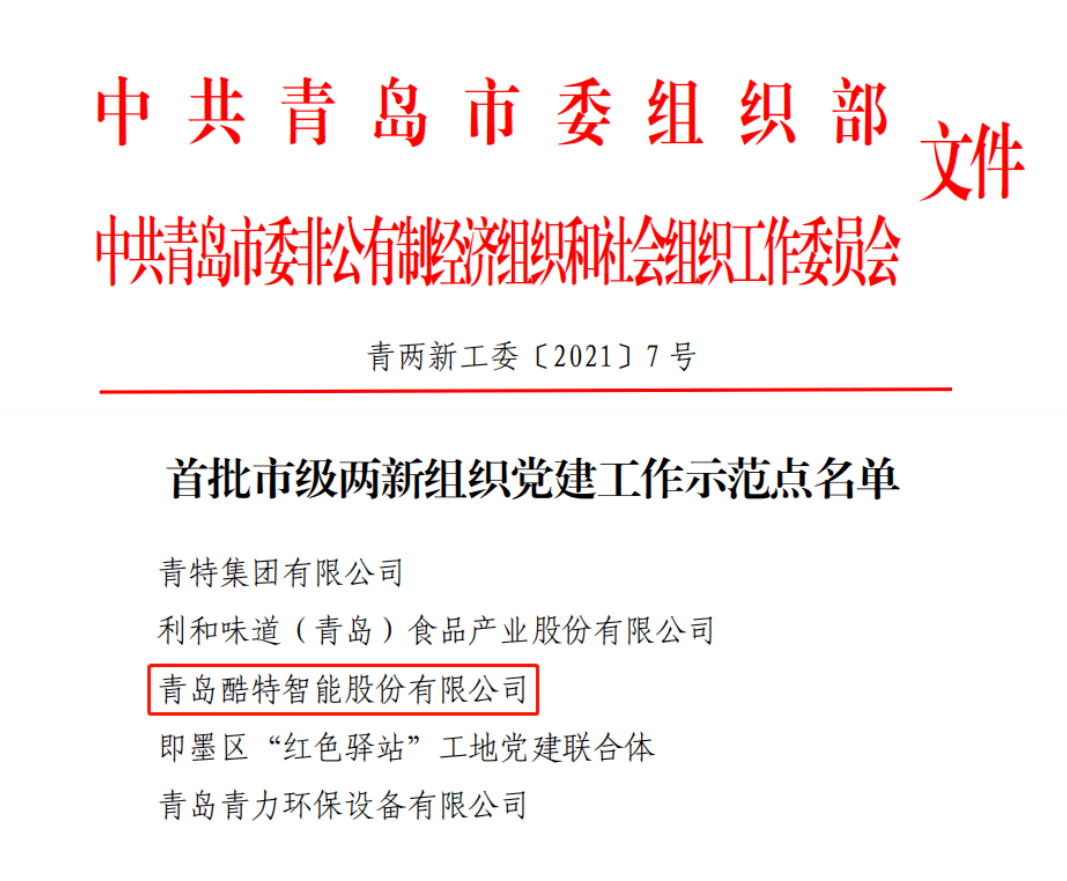 2022年初,酷特智能曾入選“青島首批市級(jí)兩新組織黨建工作示范點(diǎn)”,這是酷特智能黨支部“堅(jiān)持黨建統(tǒng)領(lǐng),貢獻(xiàn)酷特智慧”的使命導(dǎo)向結(jié)果。