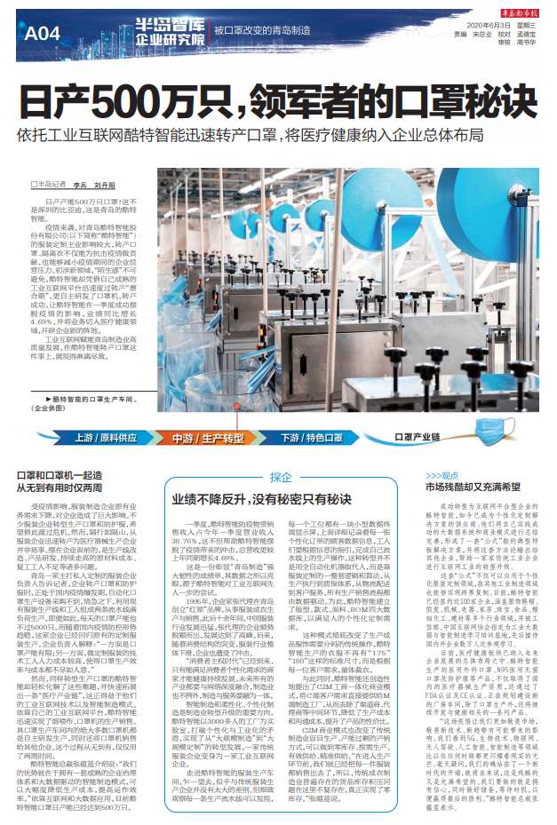 6月3日,半島新聞特別策劃“被口罩改變的青島制造”系列報道,第一篇便探秘了青島的“口罩狂人”——酷特智能。依托工業(yè)互聯(lián)網,酷特智能迅速轉產口罩,將醫(yī)療健康納入企業(yè)總體布局,日產500萬只,領軍者的口罩秘訣是什么?請看報道詳情: