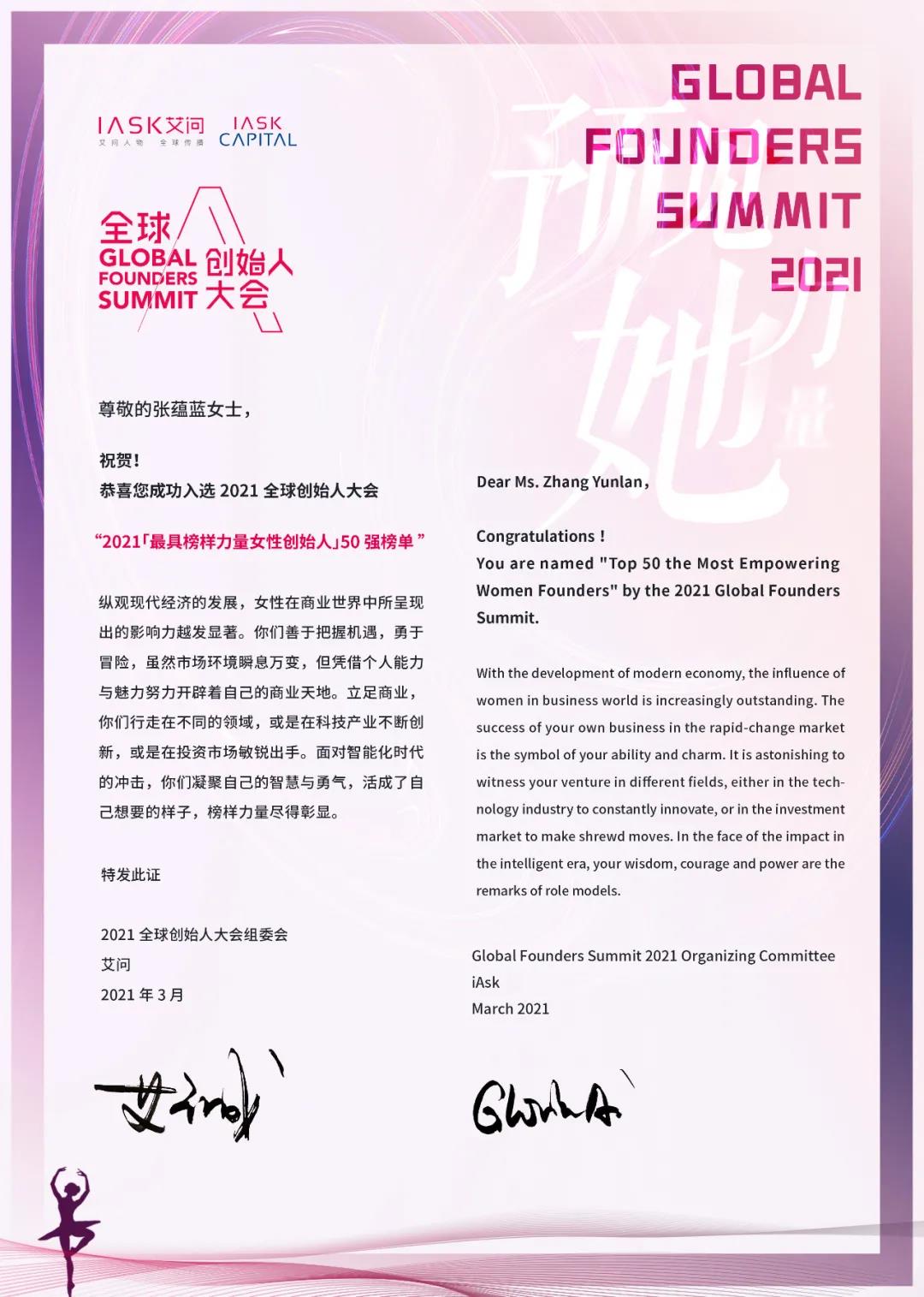 近日由《艾問(wèn)人物》發(fā)起的全球創(chuàng)始人大會(huì)正式發(fā)布2021「最具榜樣力量女性創(chuàng)始人」50 強(qiáng)榜單,酷特智能董事長(zhǎng)張?zhí)N藍(lán)實(shí)力上榜。